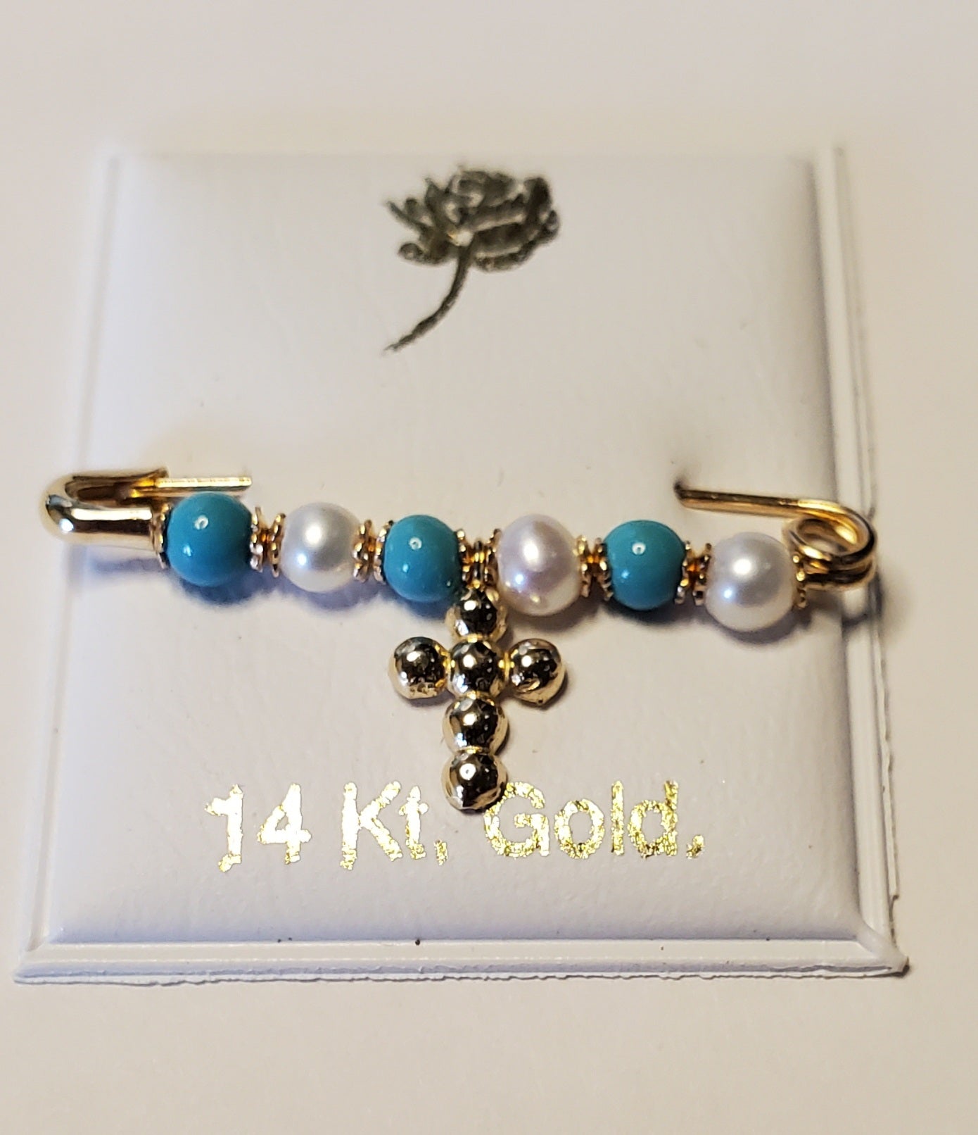 14 KT Pin with genuine pearl and turquoise bead with 14 KT gold cross charm. This lays flat on the baby clothing. Not recommended for strollers.