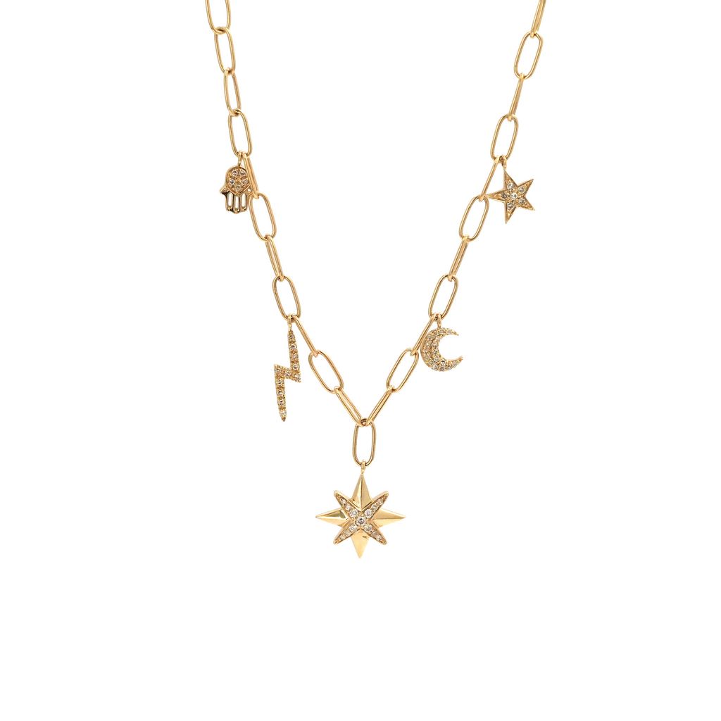 14 KT Diamond Lightening Bolt, Crescent Moon, Star, hand North Star paper clip link necklace